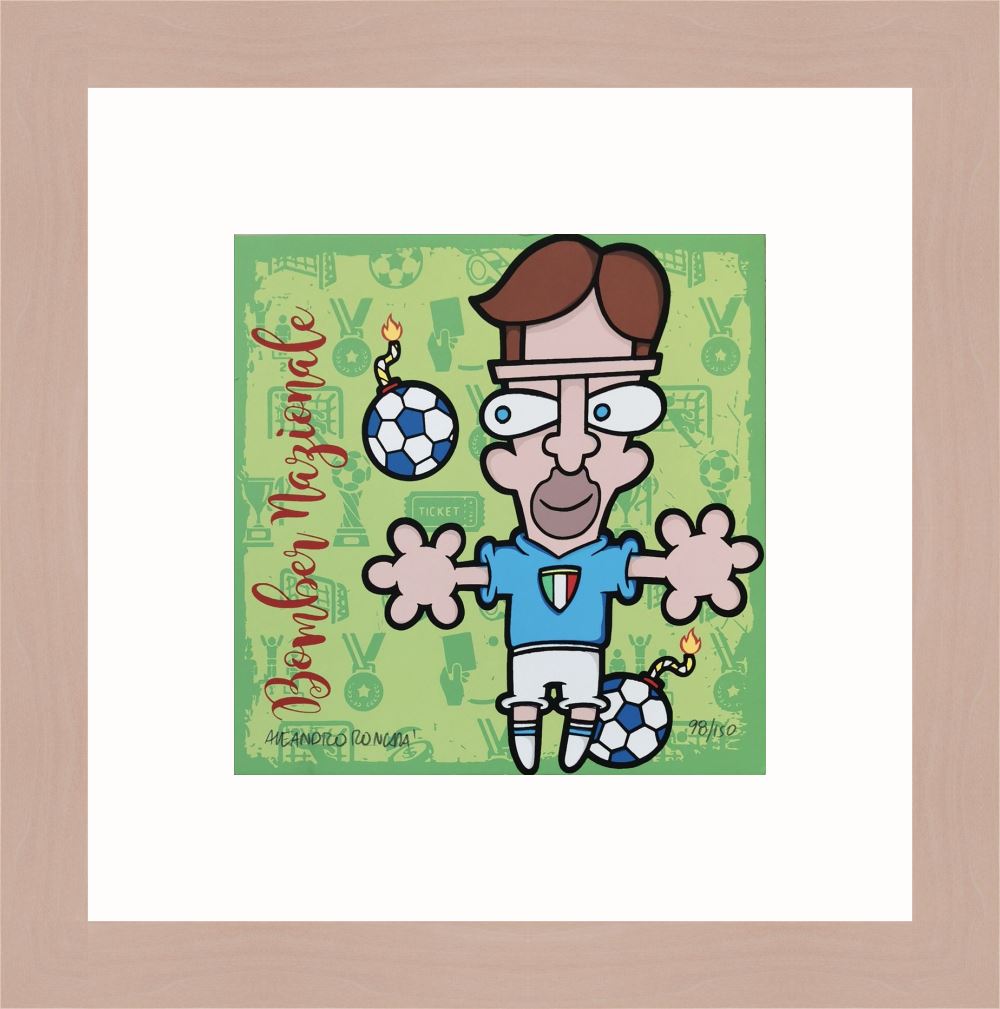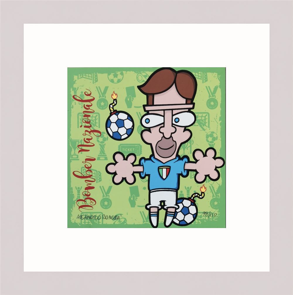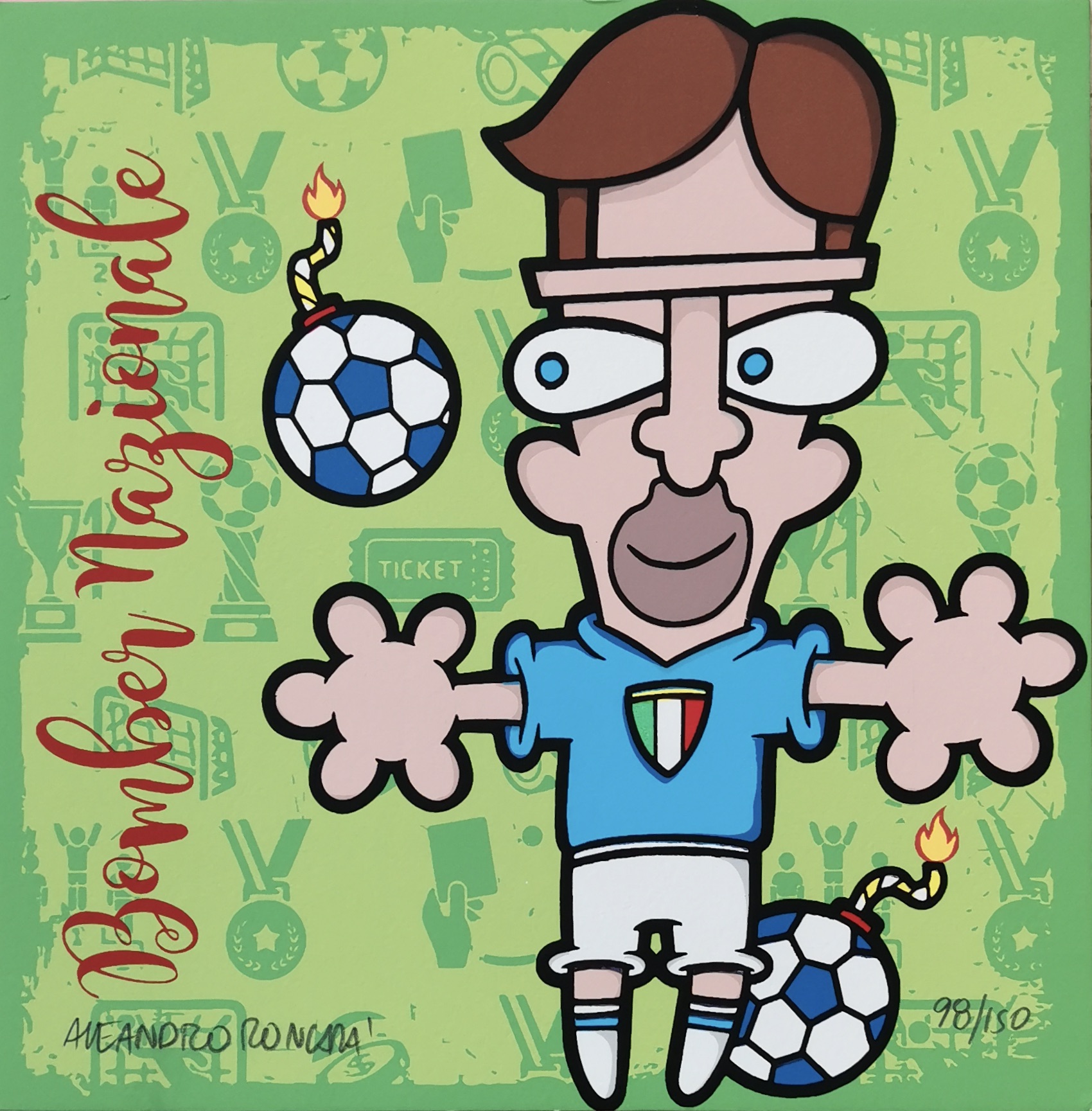 Aleandro Roncarà “Bomber nazionale” serigrafia su cartone cm. 20×20, edizione in 150 esemplari firmati e numerati manualmente dall’artista.
