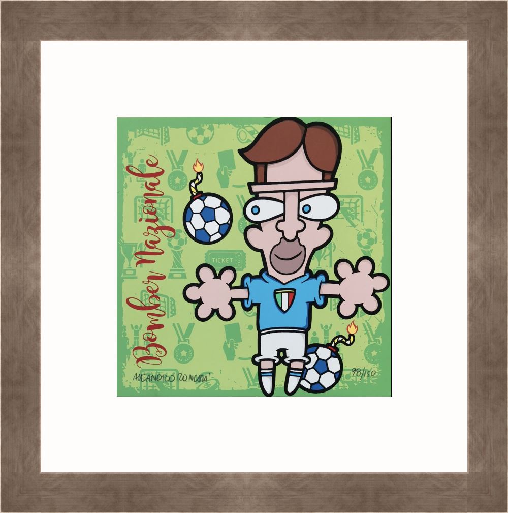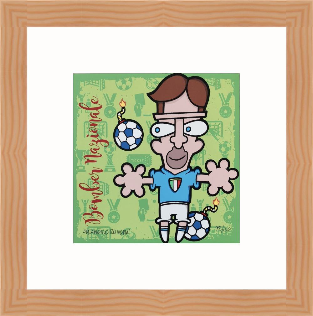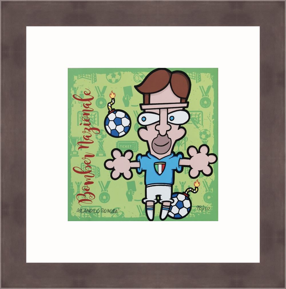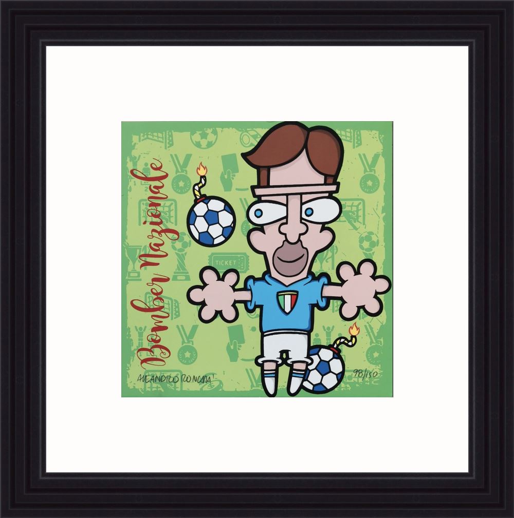 Aleandro Roncarà “Bomber nazionale” serigrafia su cartone cm. 20×20, edizione in 150 esemplari firmati e numerati manualmente dall’artista.