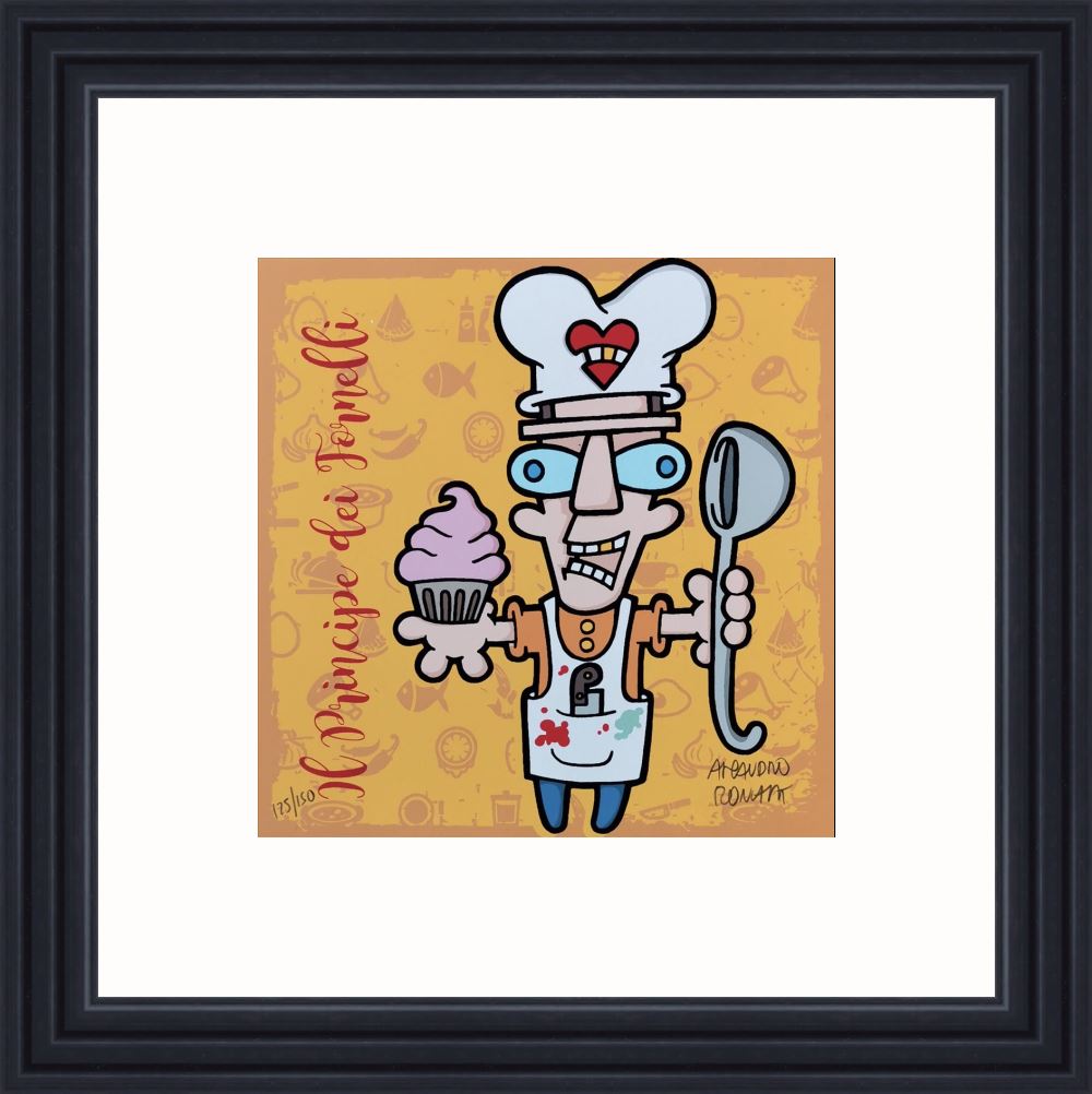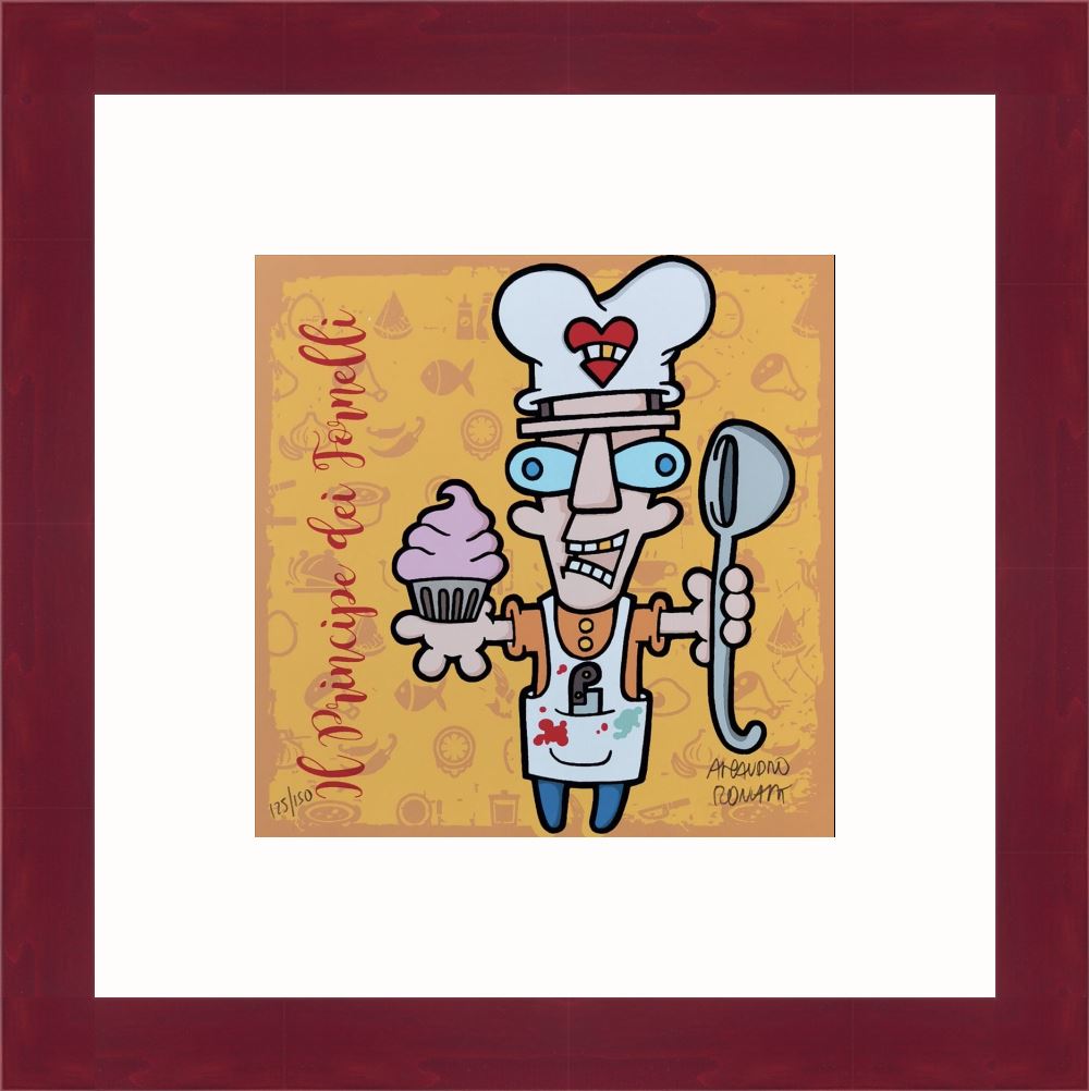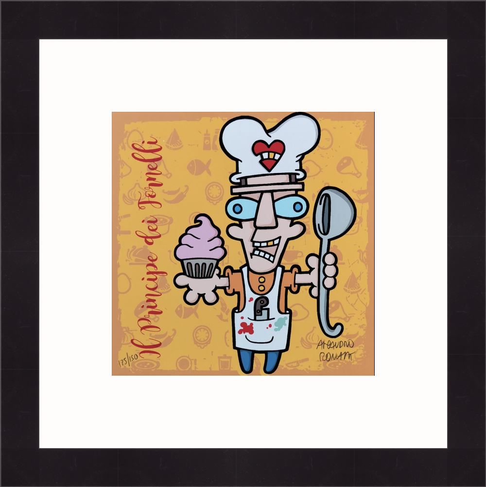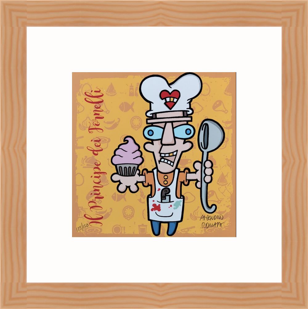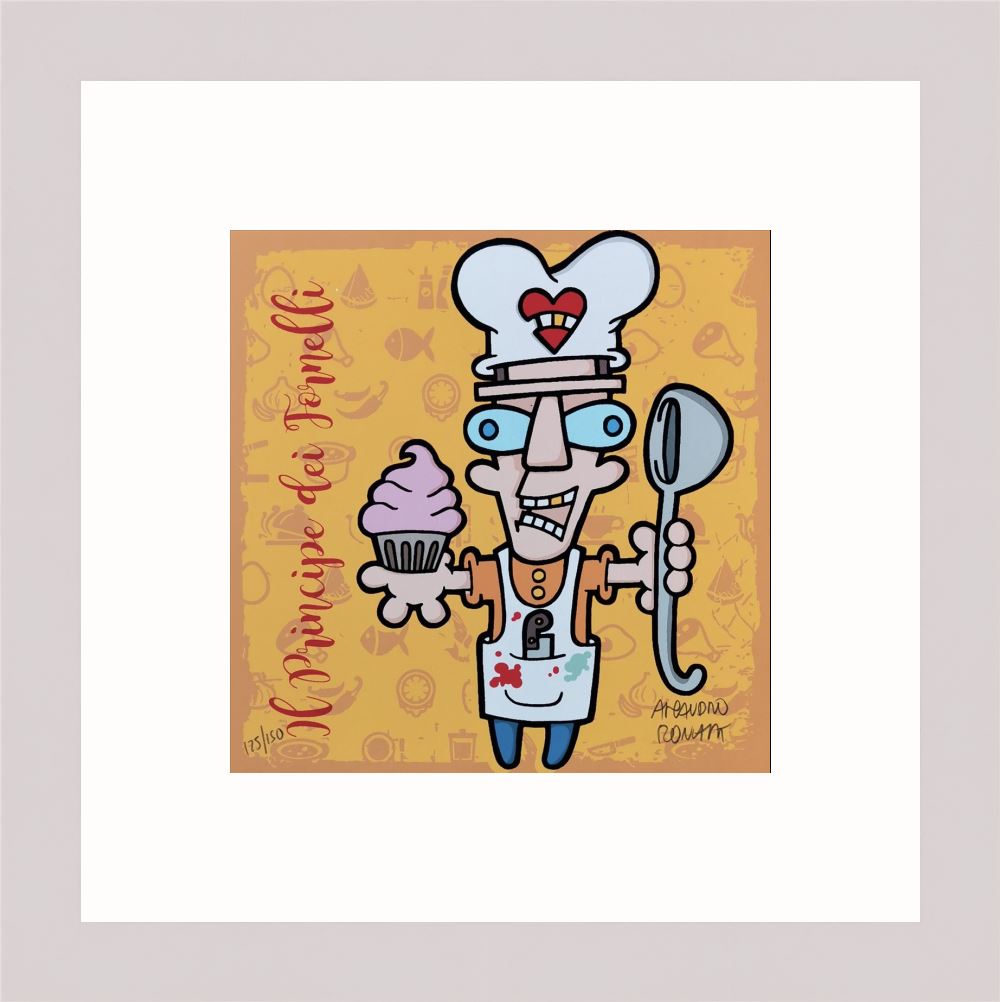 Aleandro Roncarà “Il principe dei fornelli” serigrafia su cartone cm. 20×20, edizione in 150 esemplari firmati e numerati manualmente dall’artista.