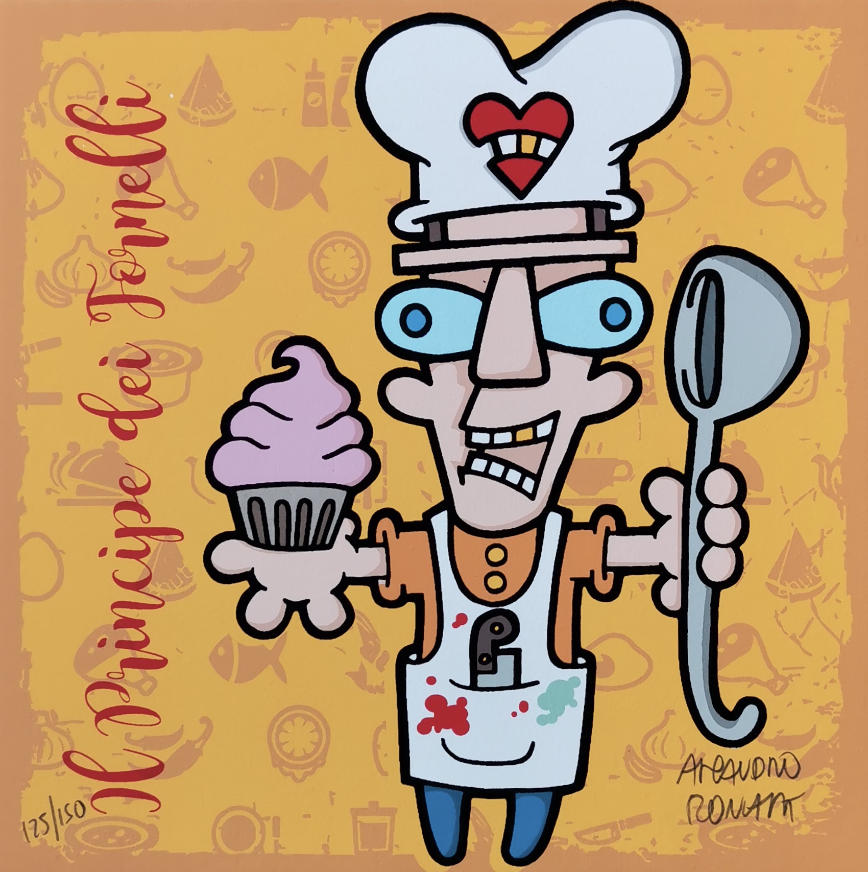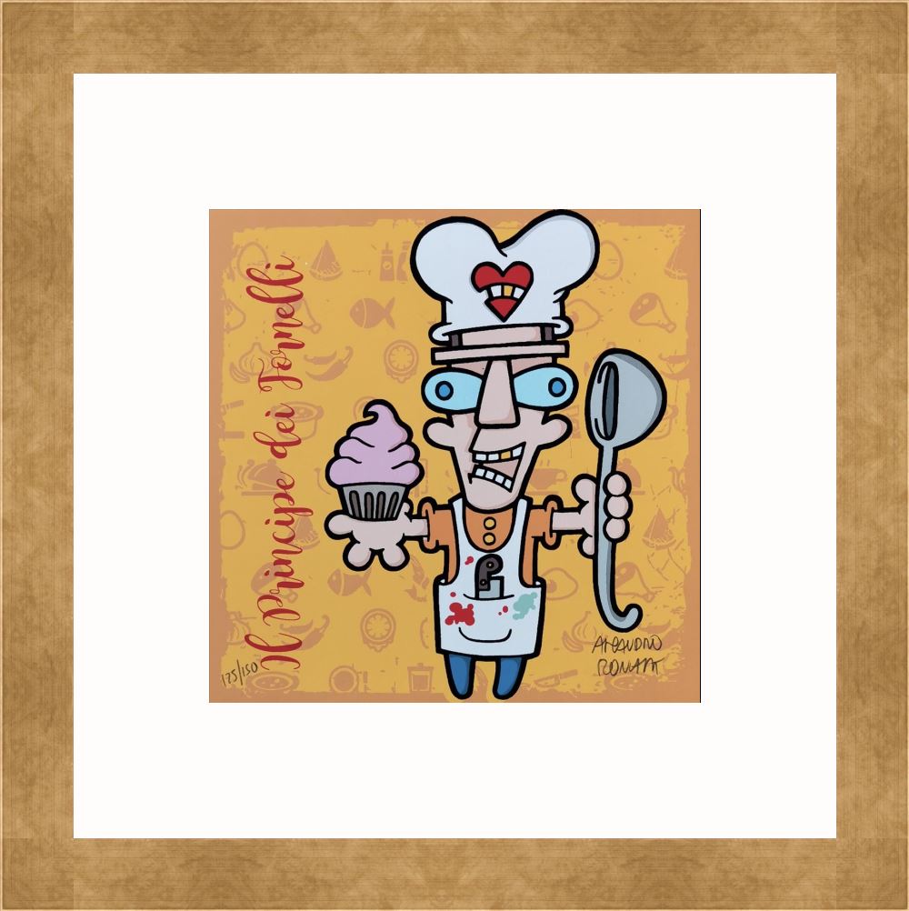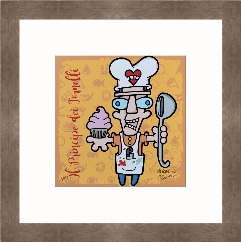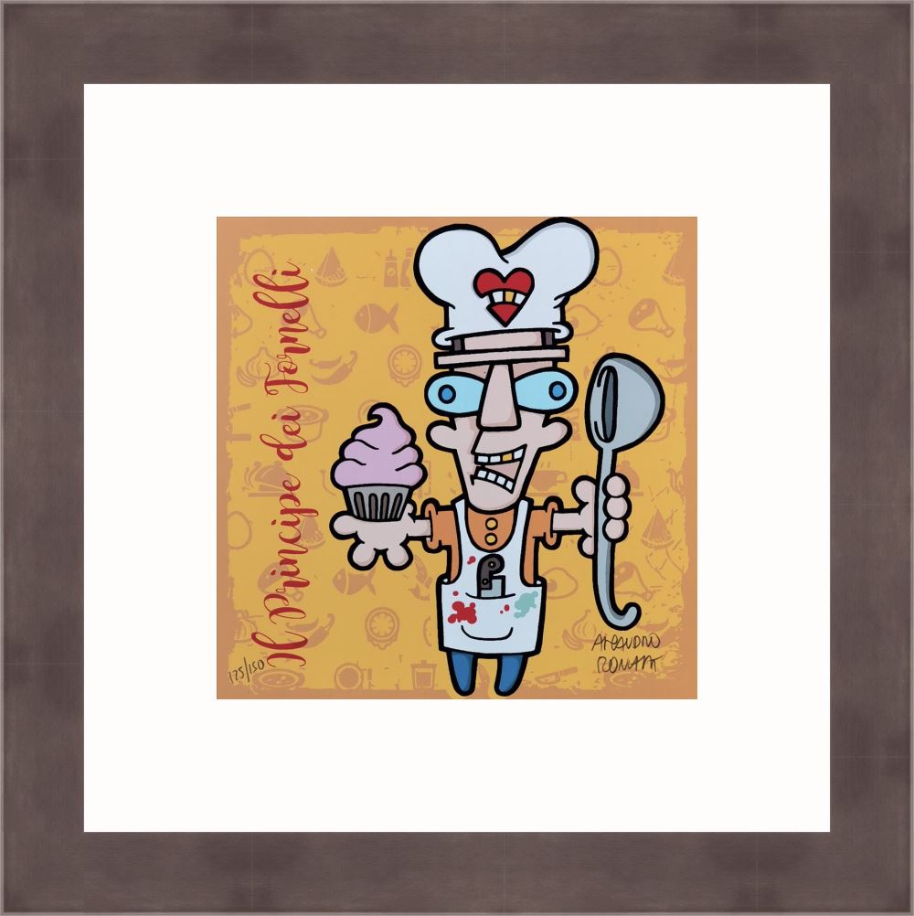 Aleandro Roncarà “Il principe dei fornelli” serigrafia su cartone cm. 20×20, edizione in 150 esemplari firmati e numerati manualmente dall’artista.
