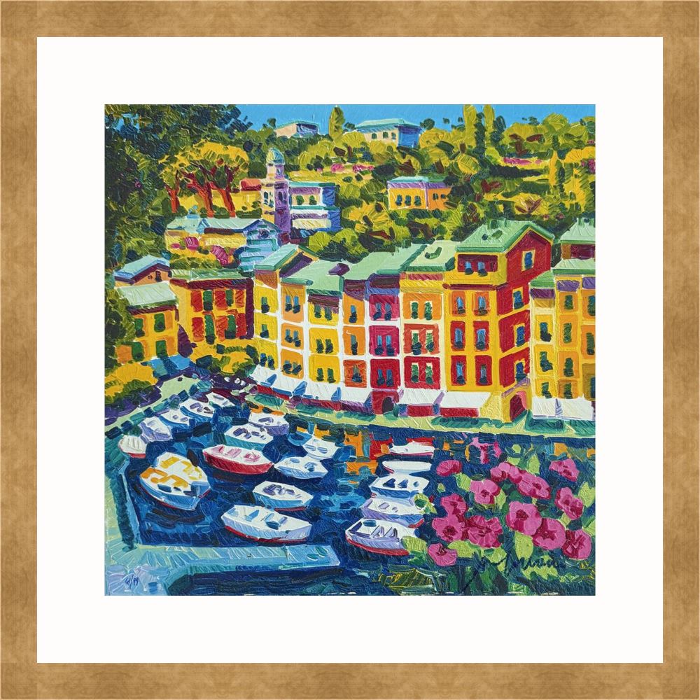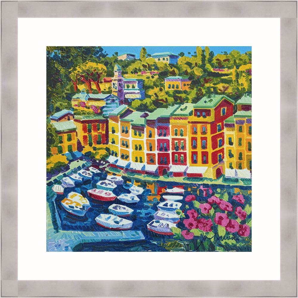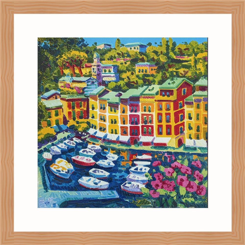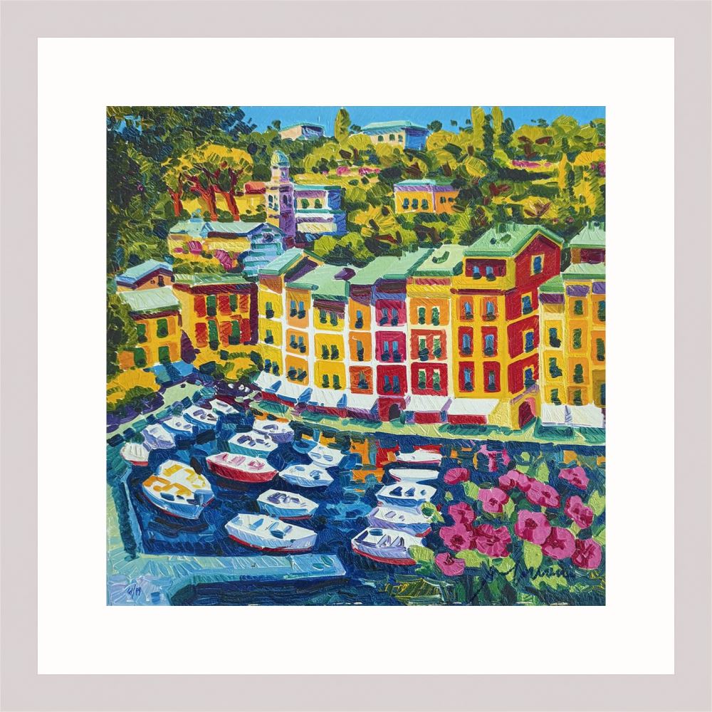 Athos Faccincani “Portofino e luce sul porto” serigrafia su cartone, edizione in 99 esemplari firmati e numerati manualmente dall’artista.