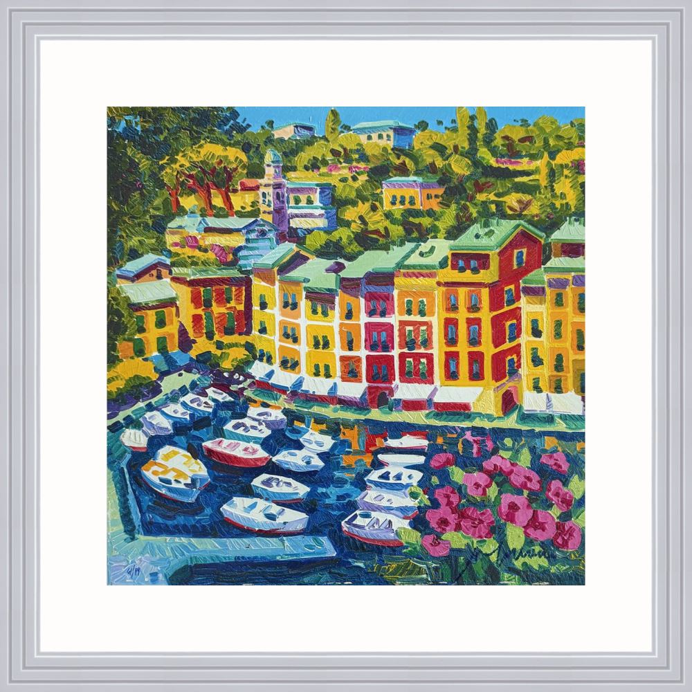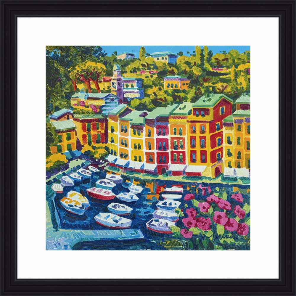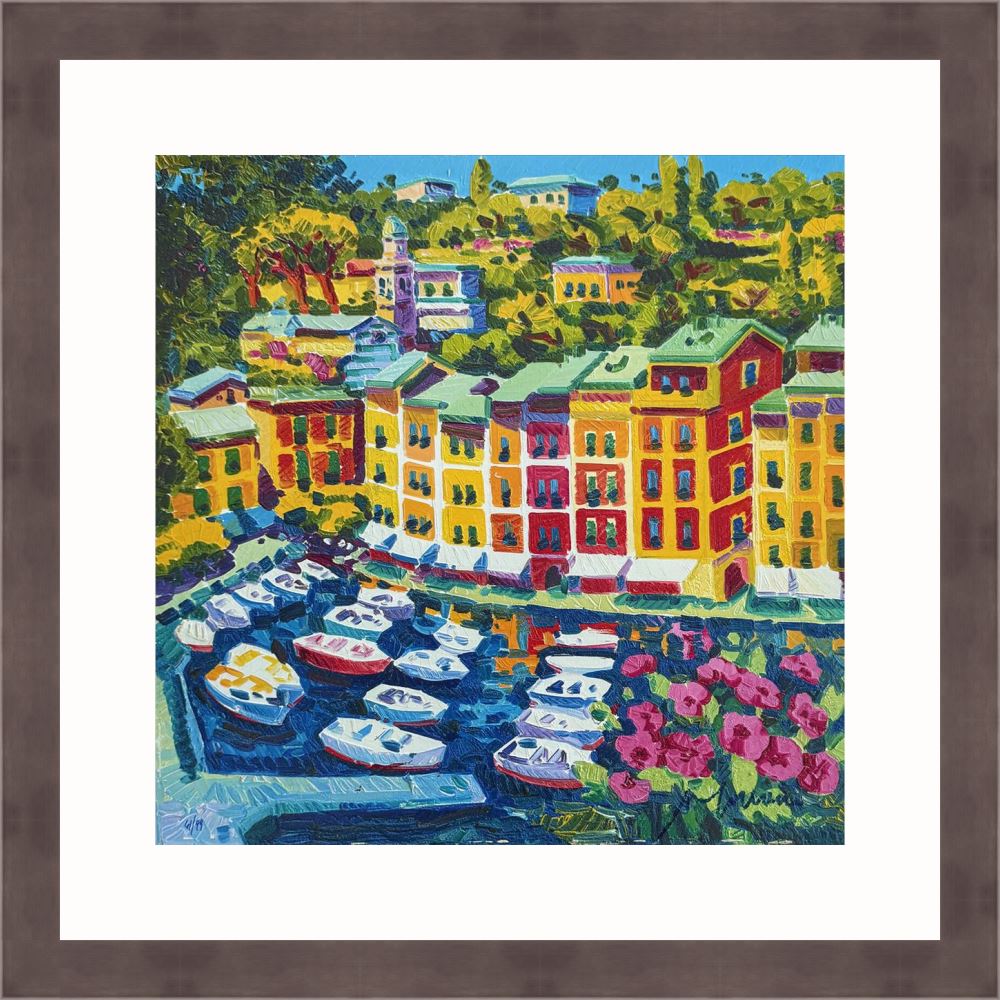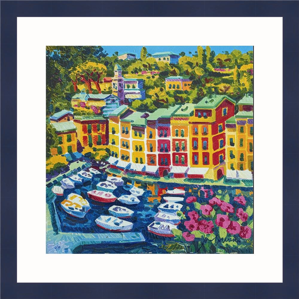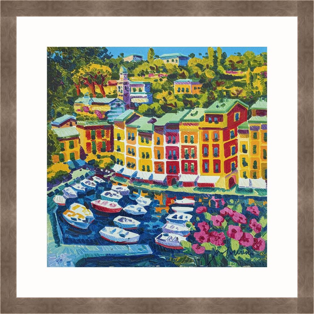 Athos Faccincani “Portofino e luce sul porto” serigrafia su cartone, edizione in 99 esemplari firmati e numerati manualmente dall’artista.