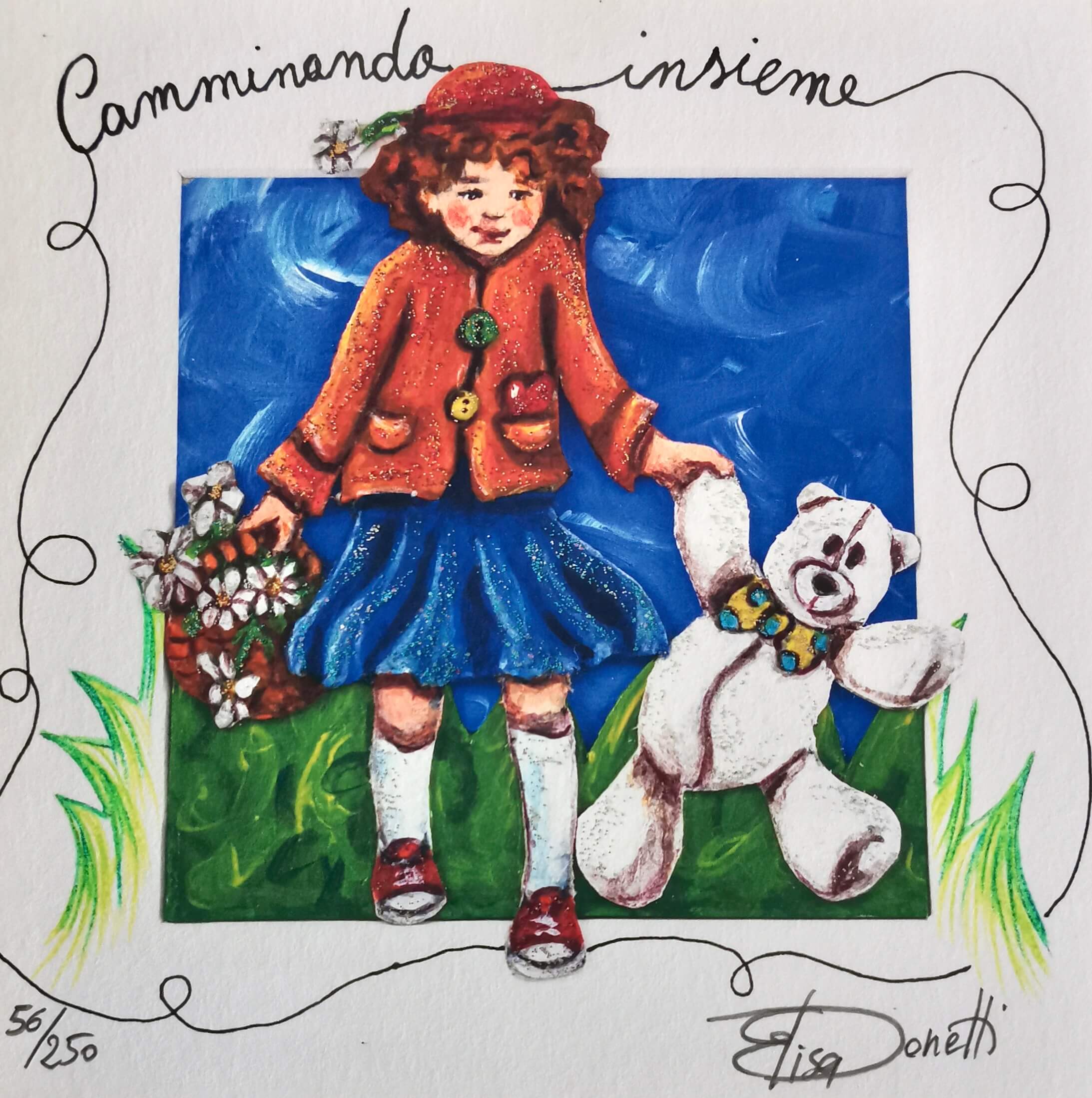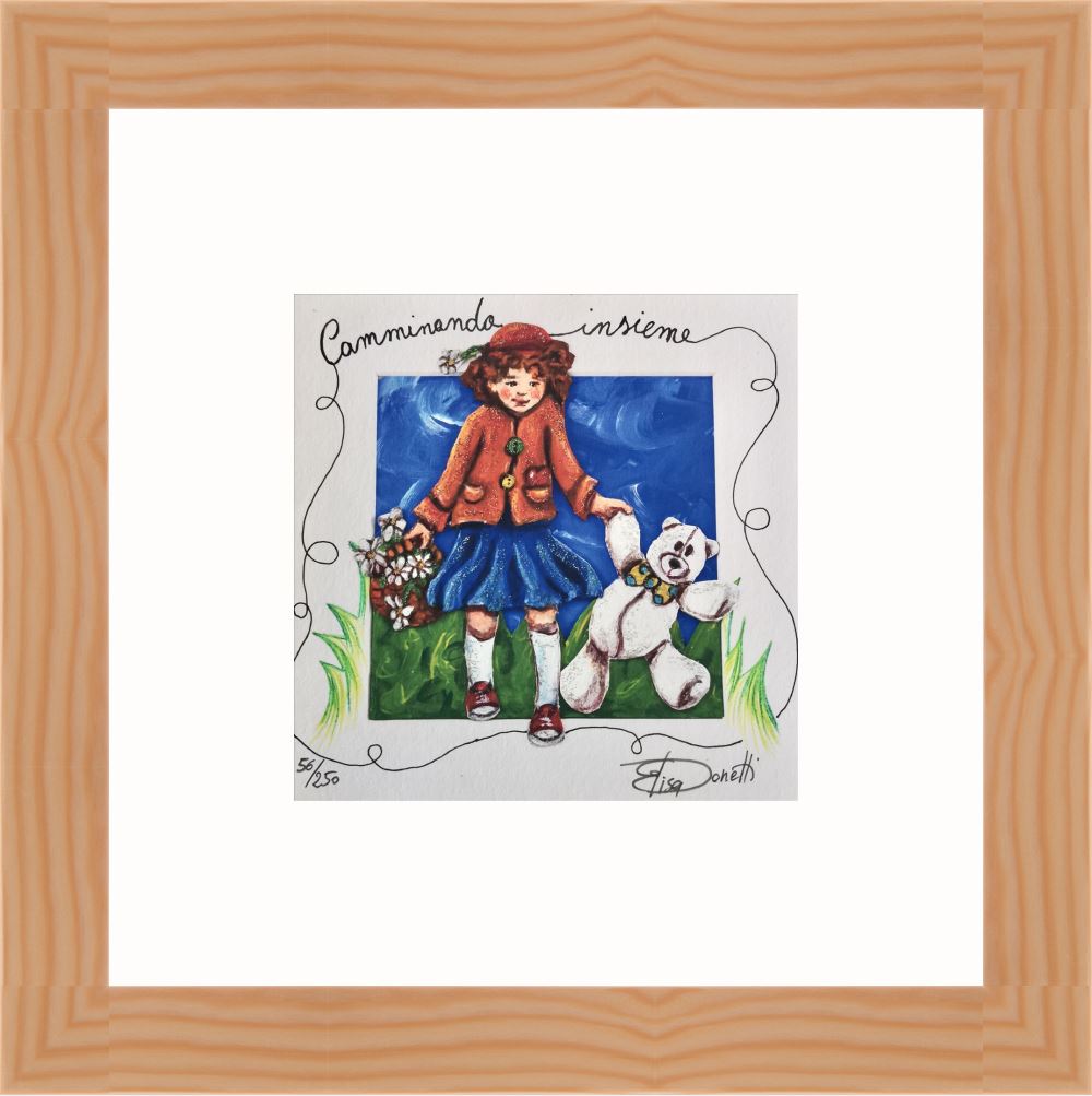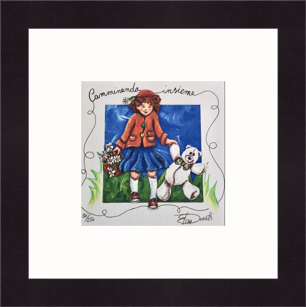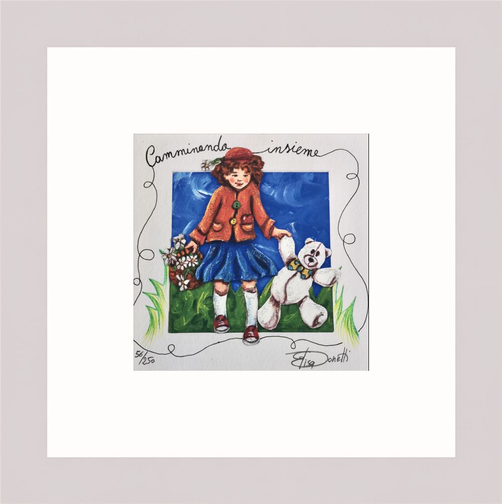Elisa Donetti “Camminando insieme” giclée su carta cm. 15×15, raffigura una bambina ormai diventata ragazza che cammina insieme al suo vecchio orsetto di peluche.
