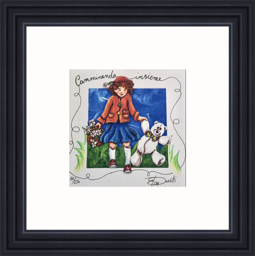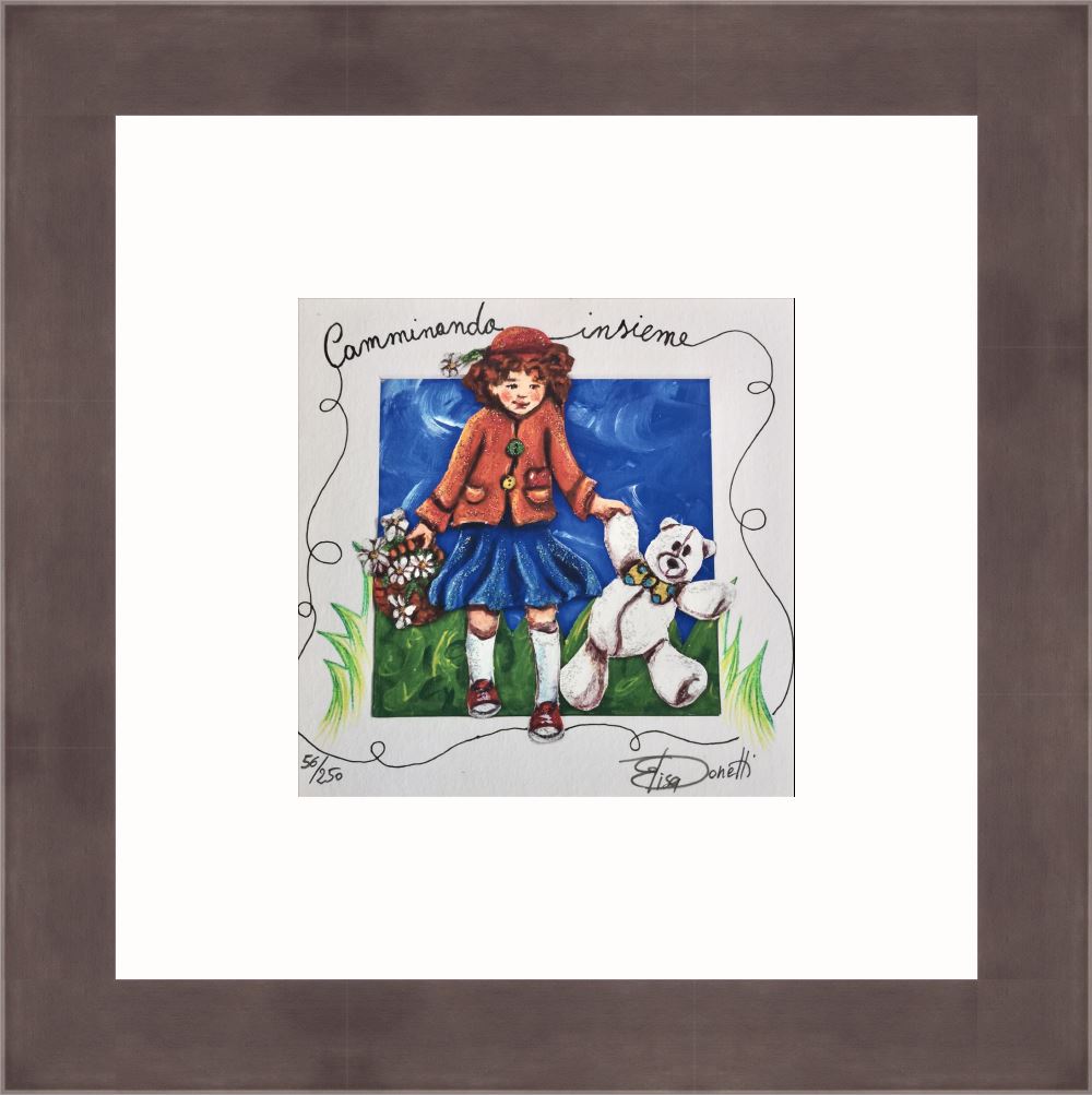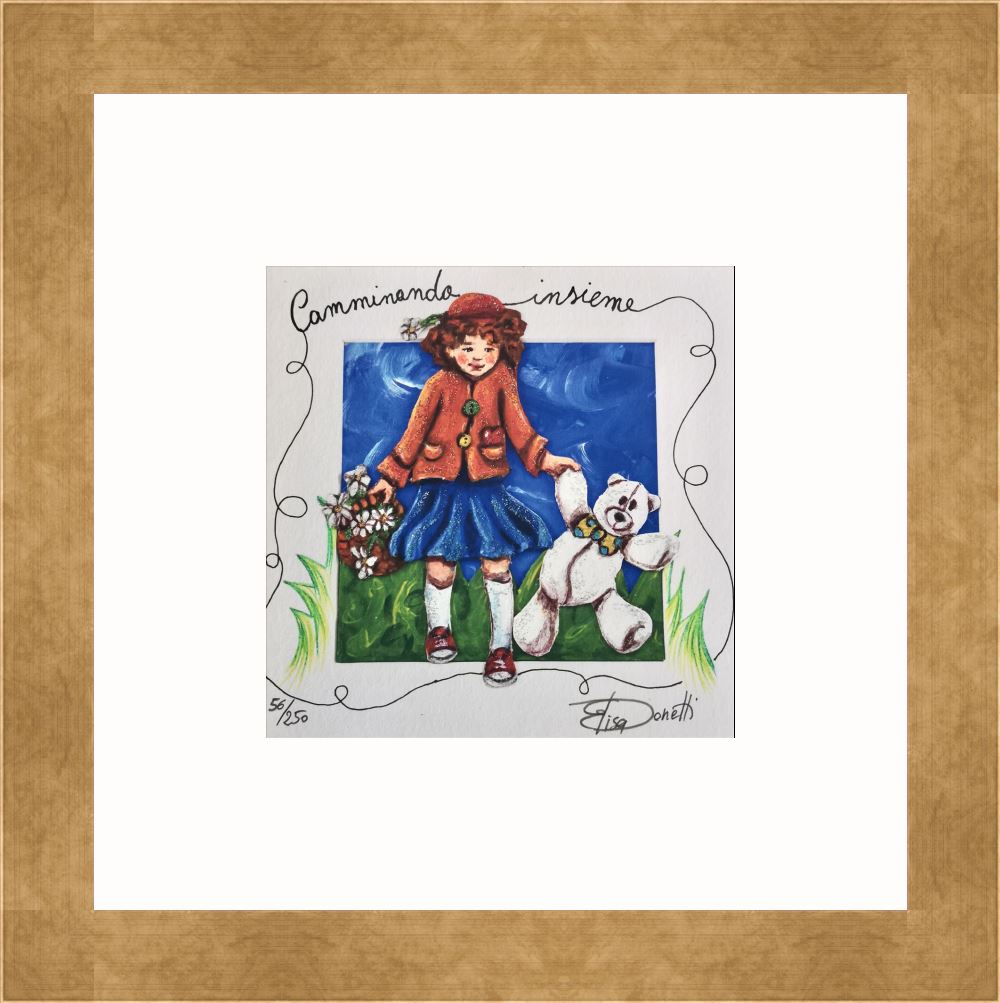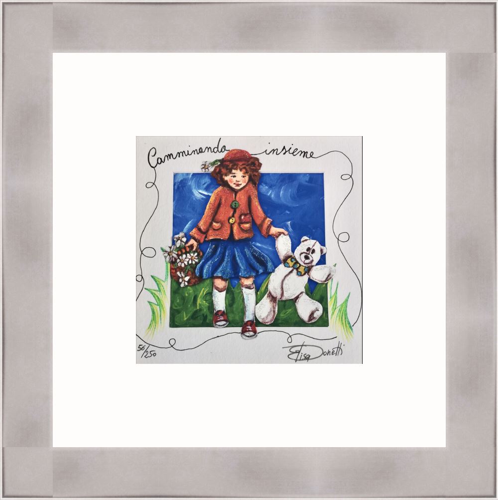 Elisa Donetti “Camminando insieme” giclée su carta cm. 15×15, raffigura una bambina ormai diventata ragazza che cammina insieme al suo vecchio orsetto di peluche.