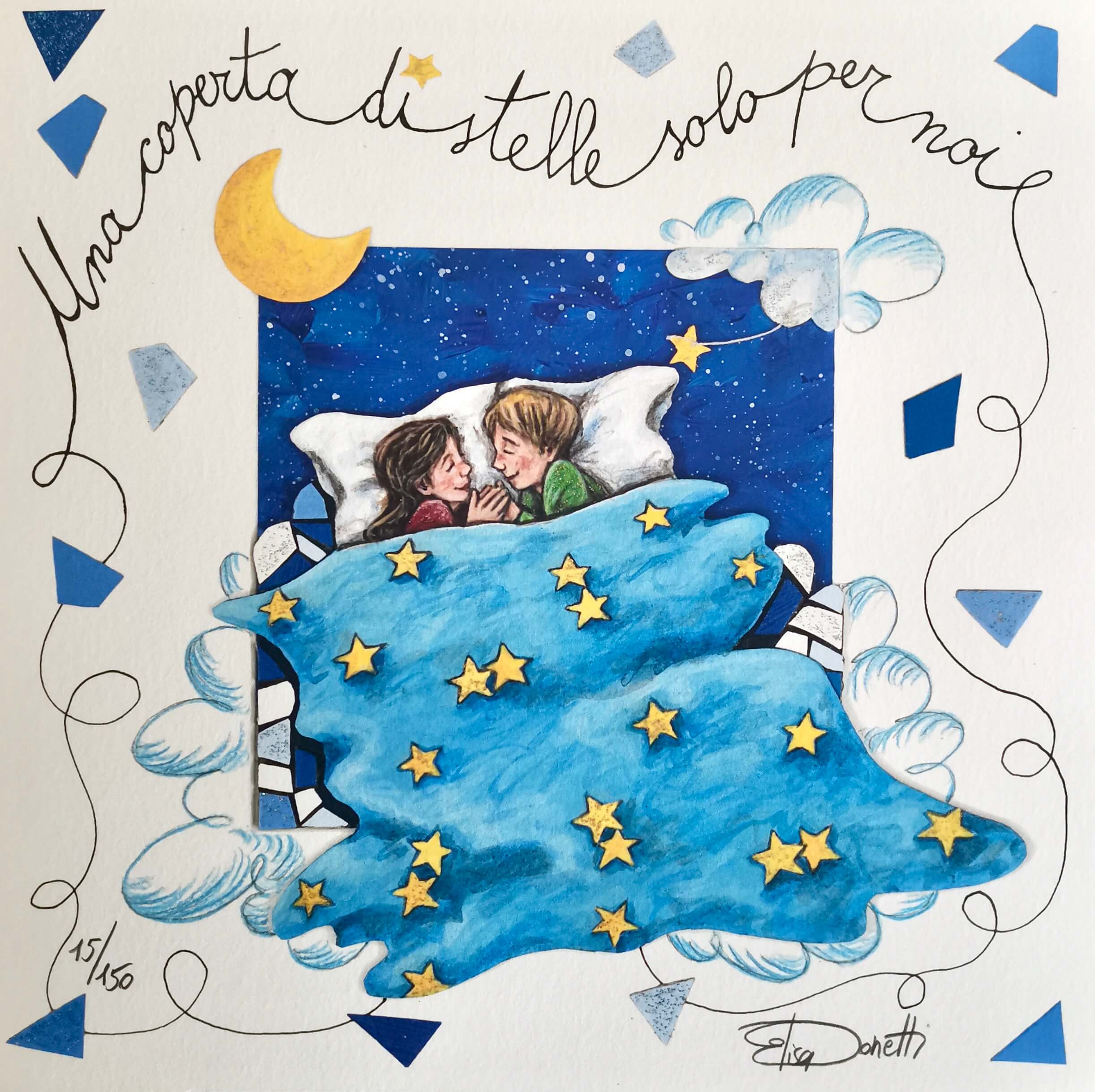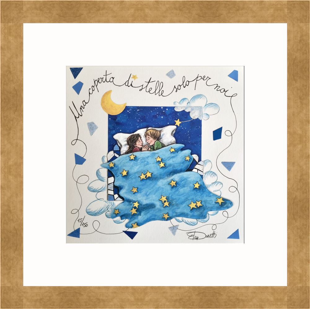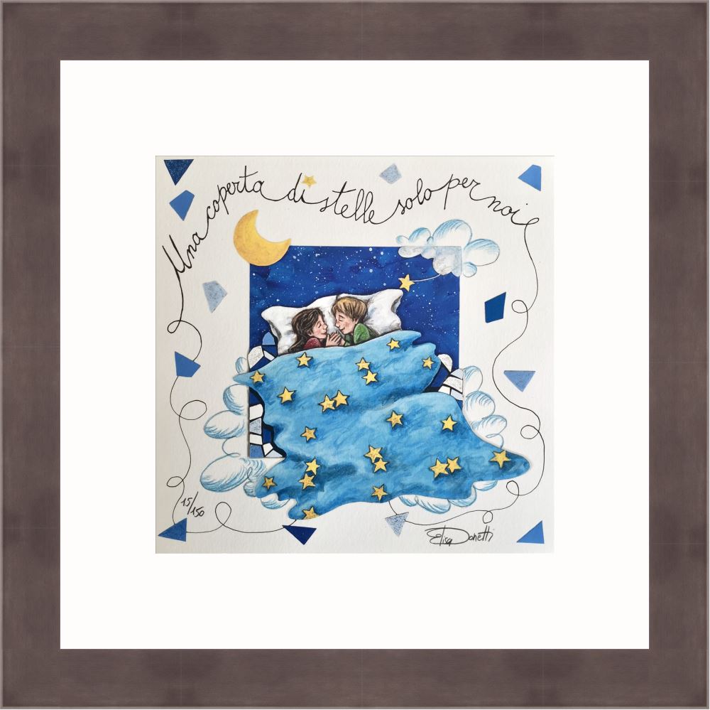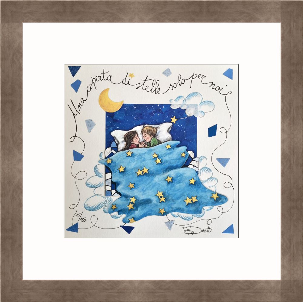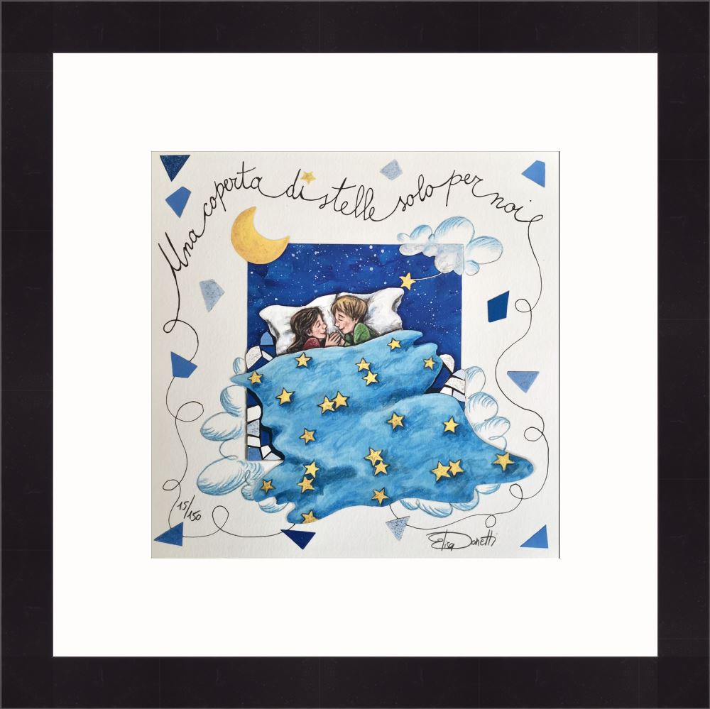 Elisa Donetti “Una coperta di stelle solo per noi” giclée su carta cm. 23×23. Una coppia di innamorati che chiacchiera sotto una splendida coperta di stelle.