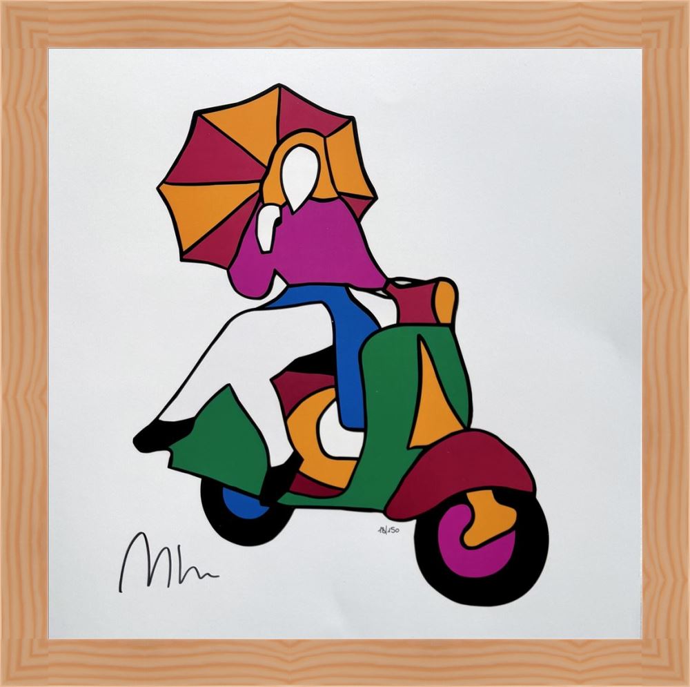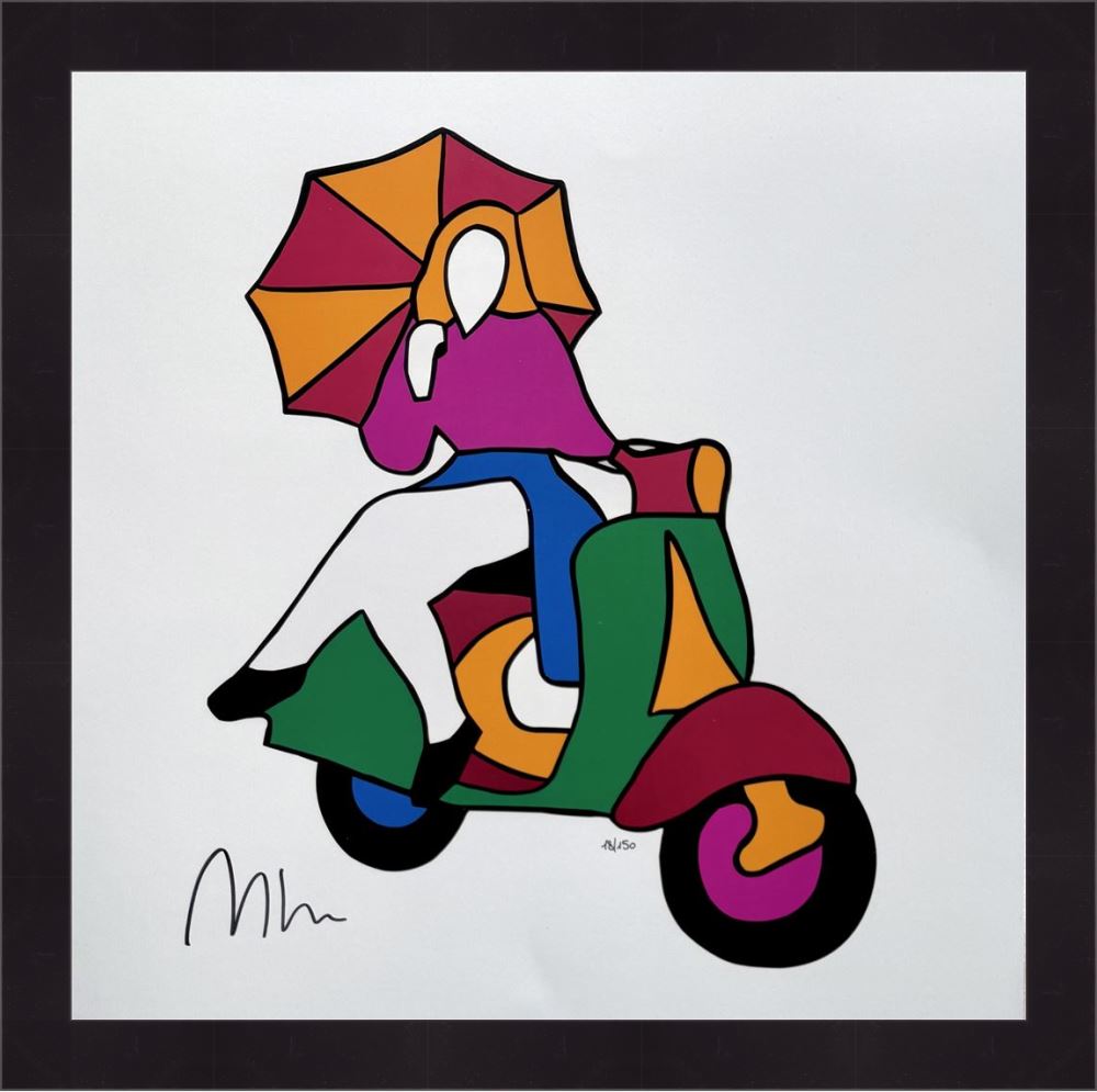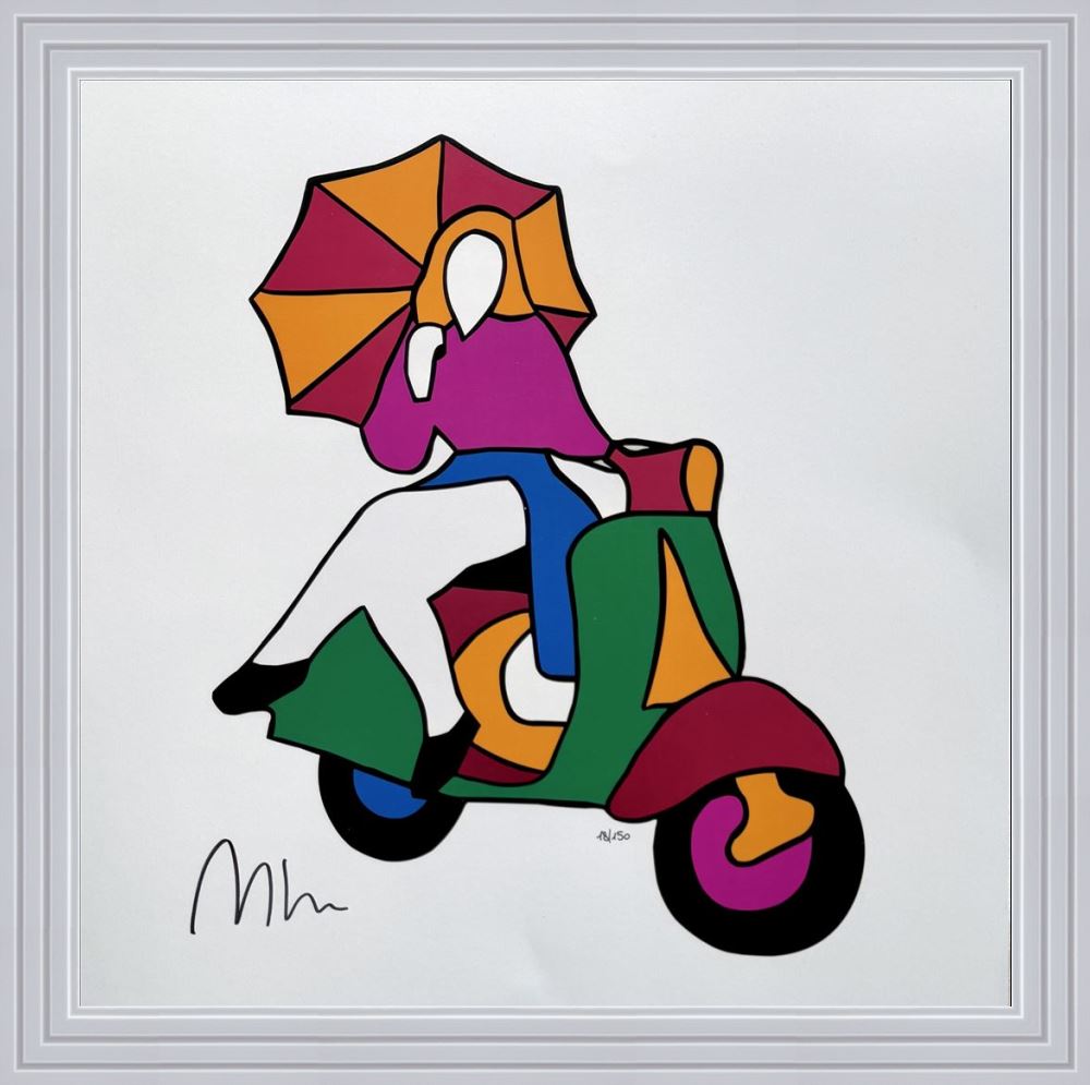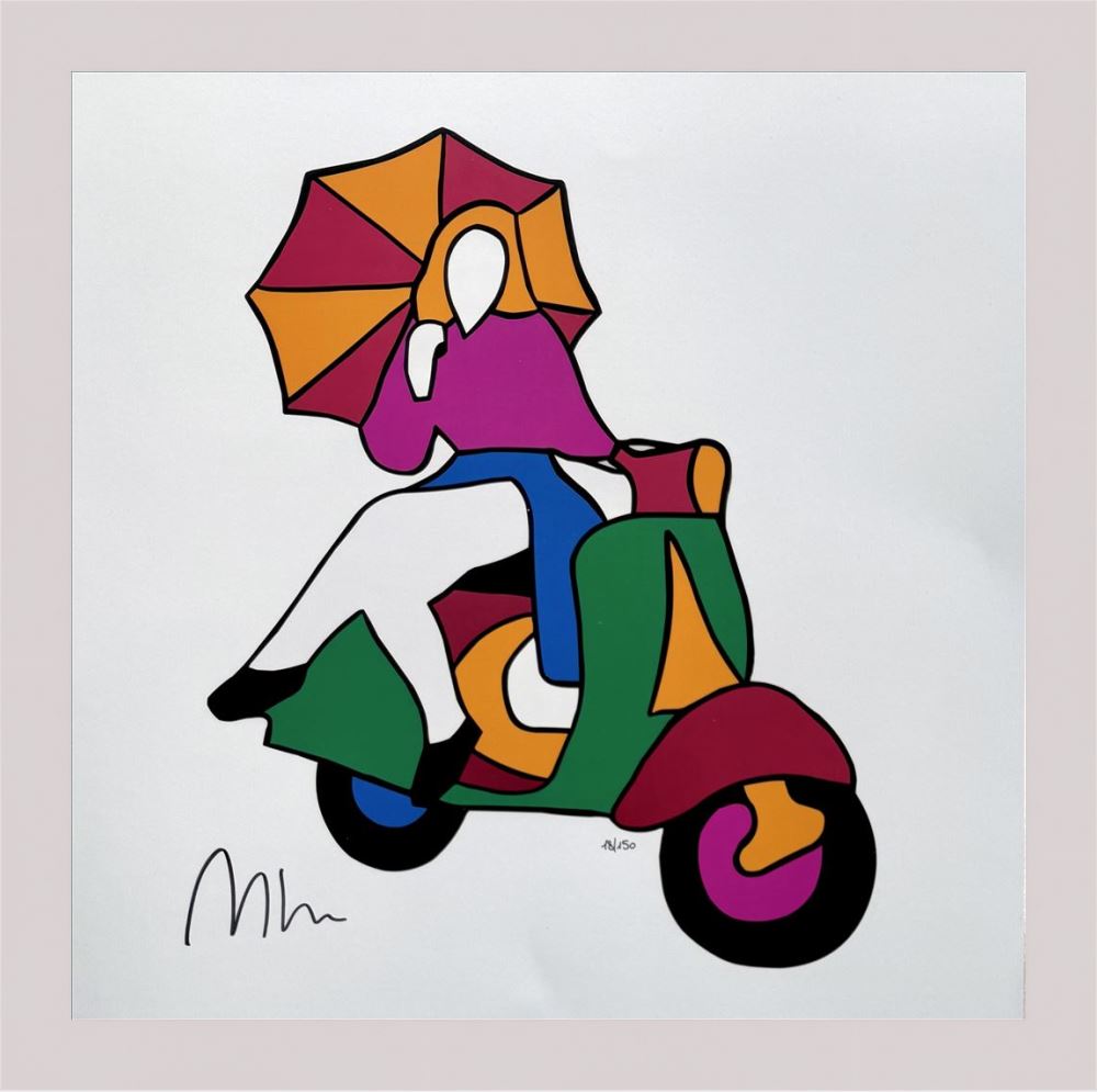 Marco Lodola “Pin up in vespa” serigrafia su carta. Edizione in 150 esemplari firmati e numerati manualmente dall’artista.