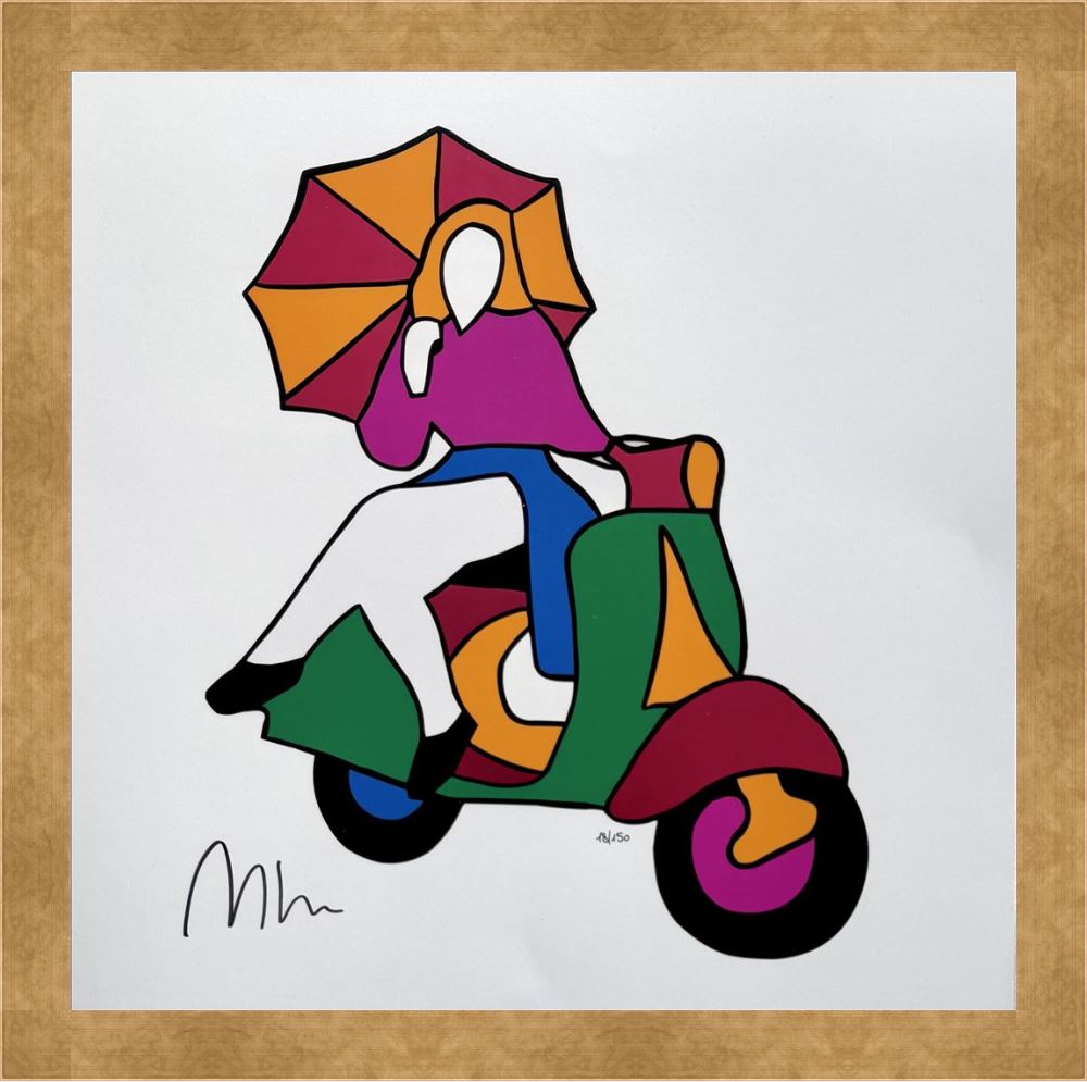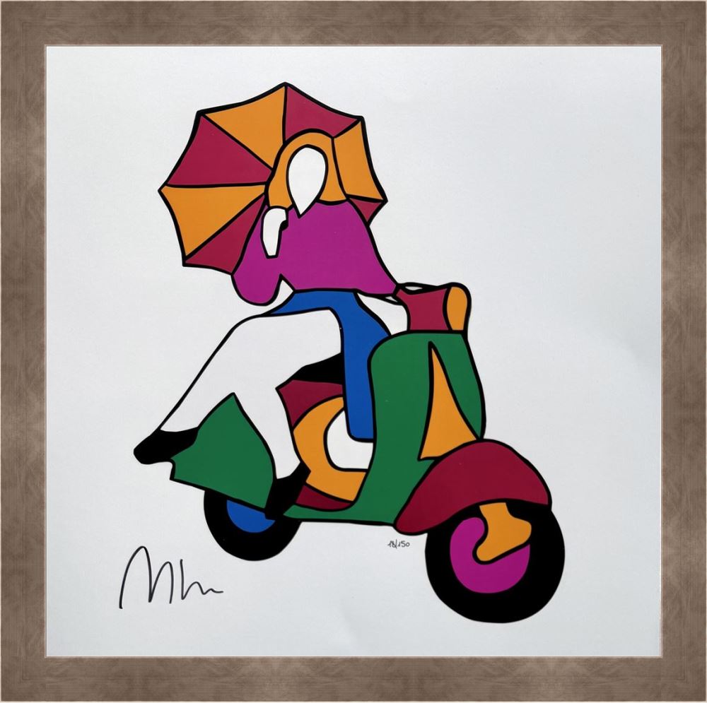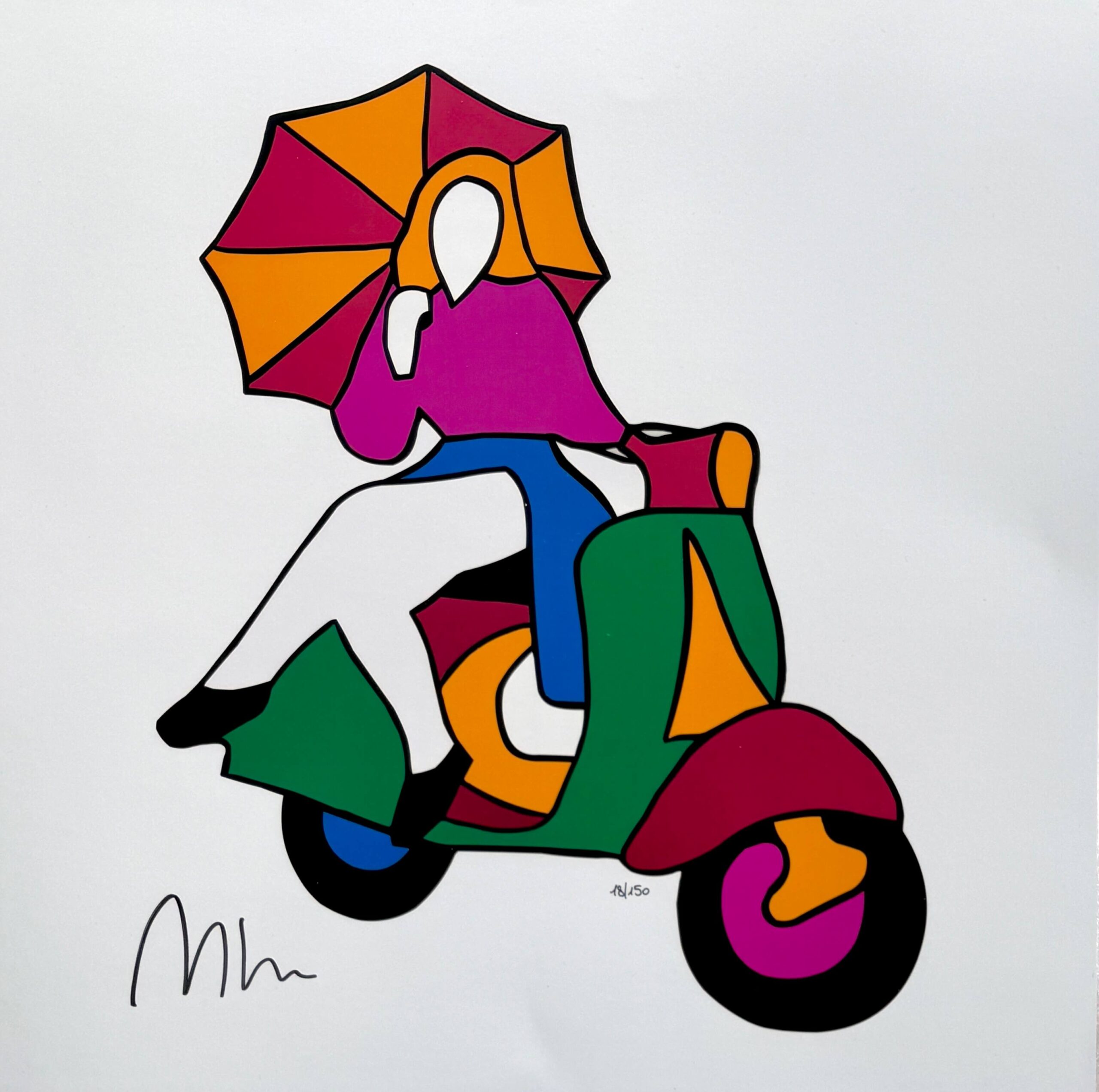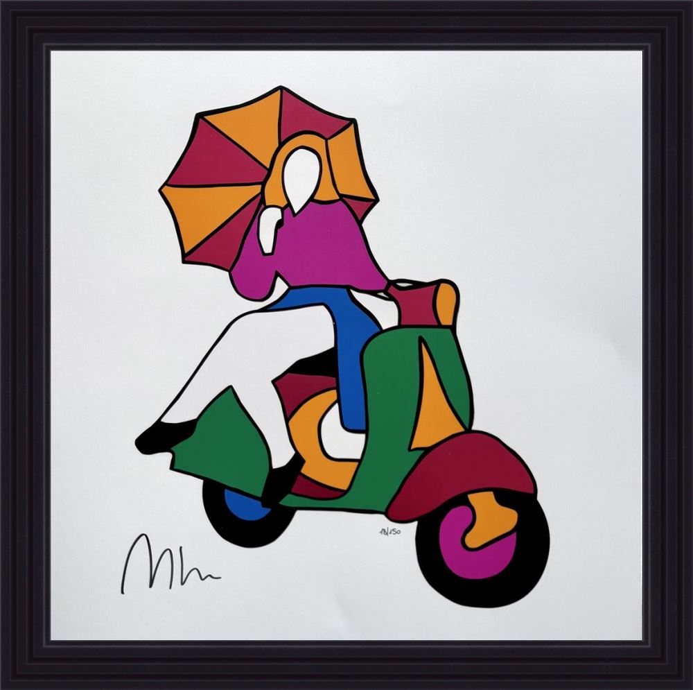 Marco Lodola “Pin up in vespa” serigrafia su carta. Edizione in 150 esemplari firmati e numerati manualmente dall’artista.